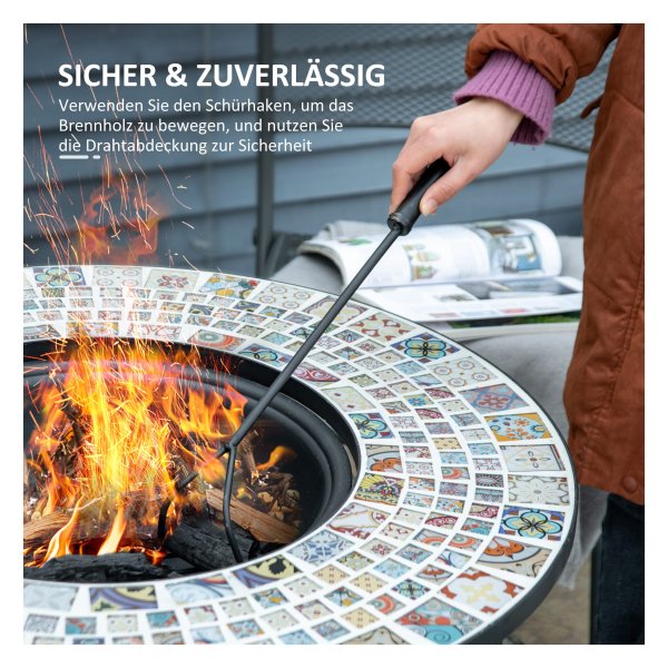 De Vuurtafel is voorzien van een vonkenvanger die voorkomt dat er vonken kunnen wegspatten. Daarnaast wordt er ook een pook meegeleverd om het hout veilig te verplaatsen en het rooster makkelijk te kunnen verwijderen.