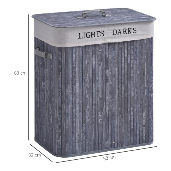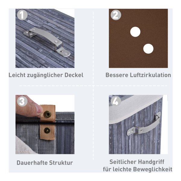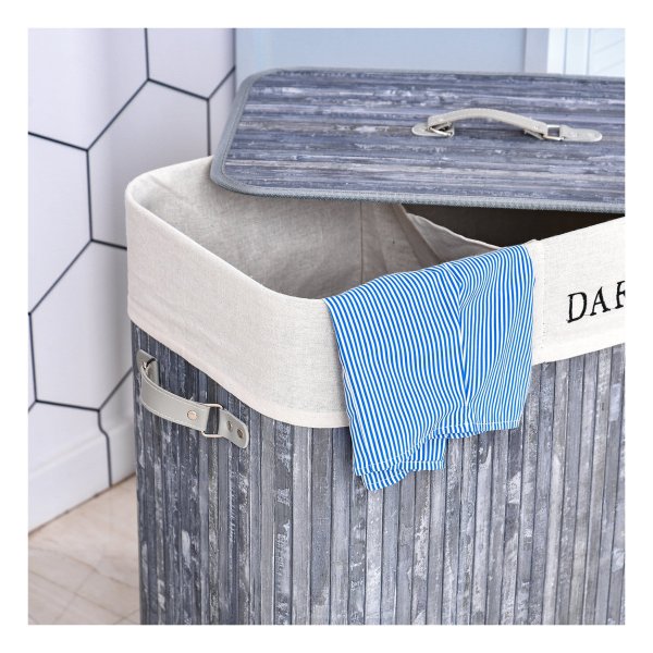 De wasmand is gemaakt van bamboe, de waszak van canvas en de handgrepen van PU-materiaal. De grijze kleur zorgt voor een tijdloze uitstraling.