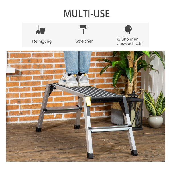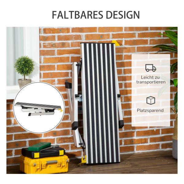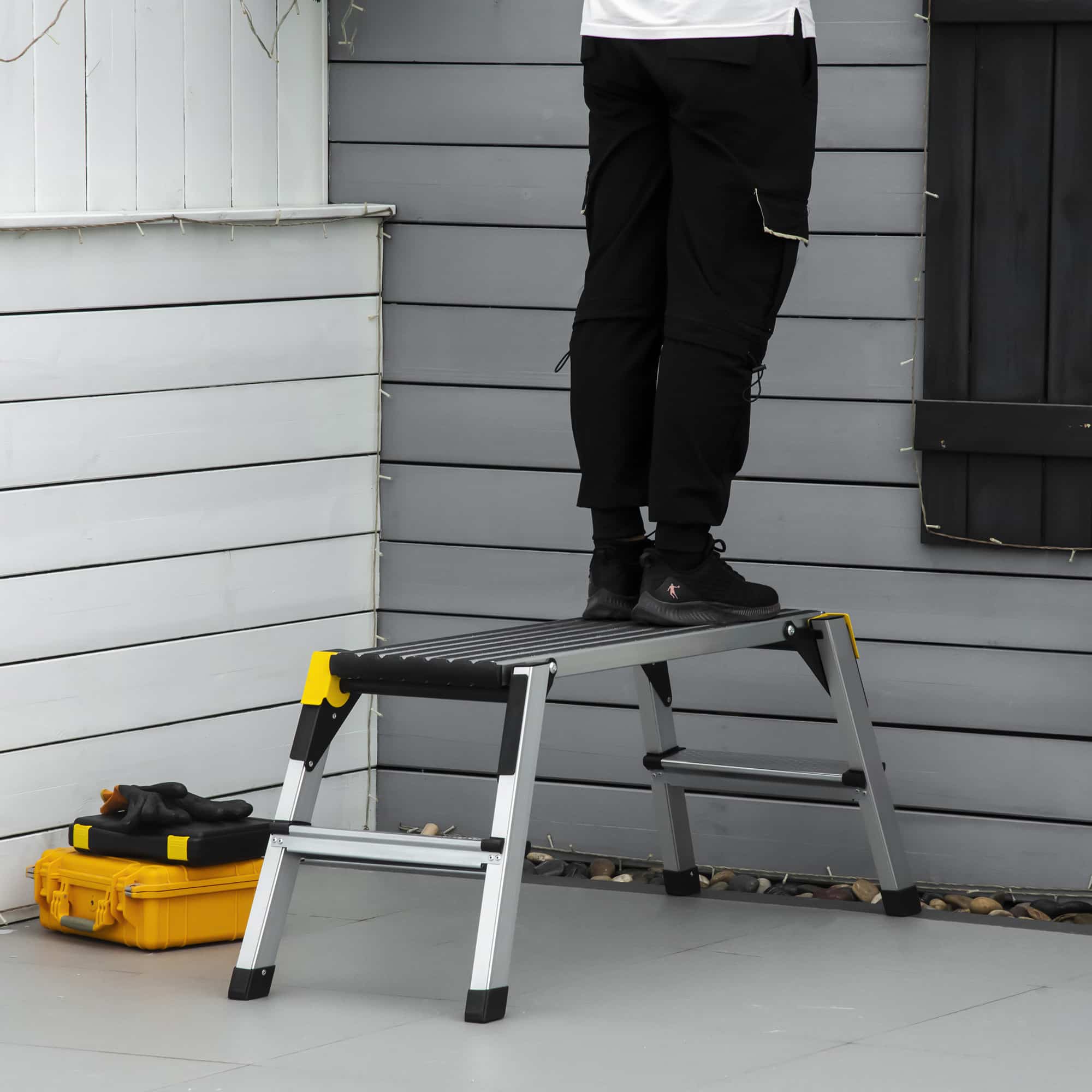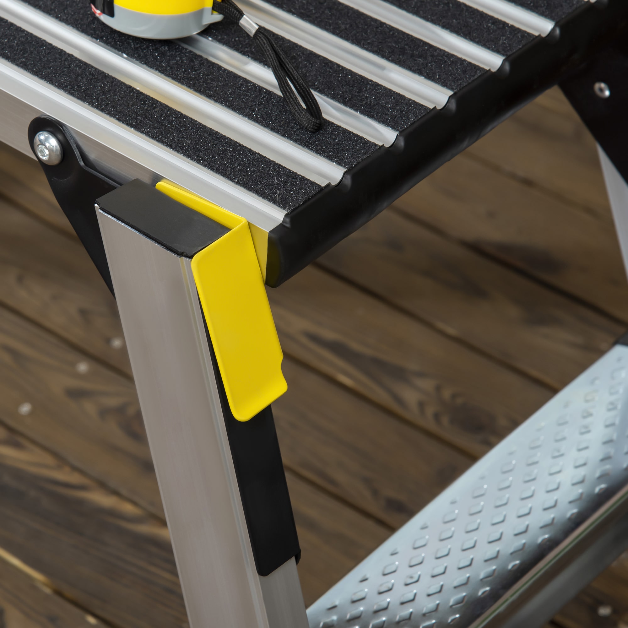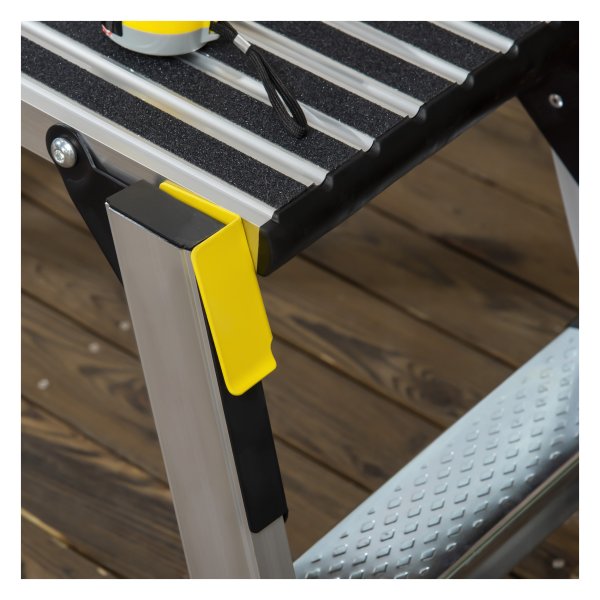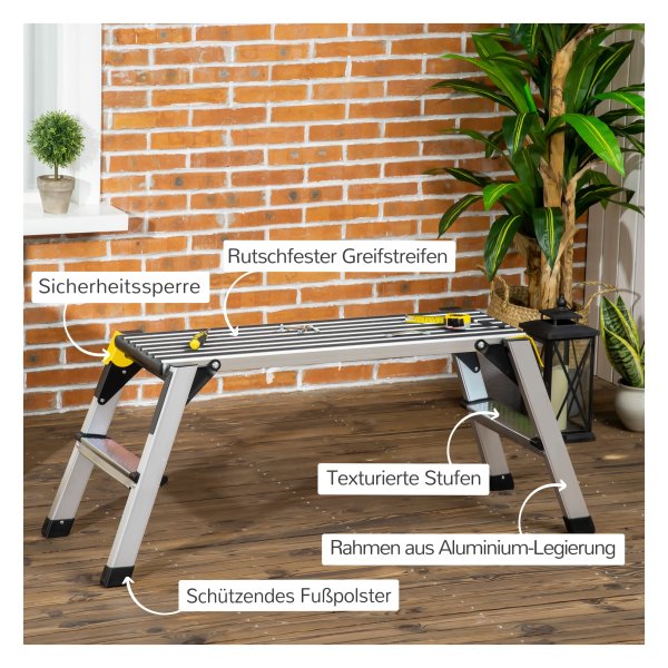 De werkbank heeft inklapbare poten met een veiligheidsvergrendeling voor stabiliteit en veiligheid tijdens gebruik. De doppen op de poten voorkomen beschadigingen aan de vloer.