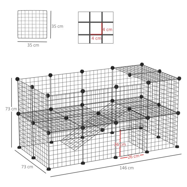 Deze veelzijdige puppyren biedt uw kleine dieren zoals puppy’s en konijnen een veilige en speelse omgeving binnenshuis. De ren bestaat uit 36 individuele metalen roosters die eenvoudig aan elkaar gekoppeld kunnen worden, zodat u de vorm naar wens kunt aanpassen. Zo kunt u een ruime speeltuin creĆ«ren waar uw huisdier vrijuit kan bewegen en spelen.